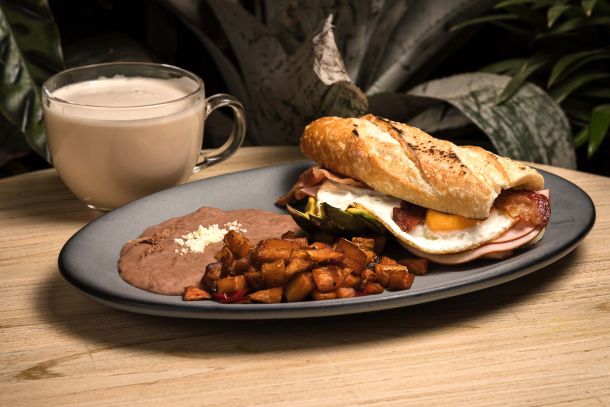 Deliciosos baguette con jamón, mix de quesos, tocino, huevo estrellado, acompañado de frijoles y papa country.