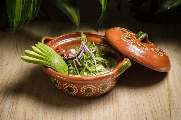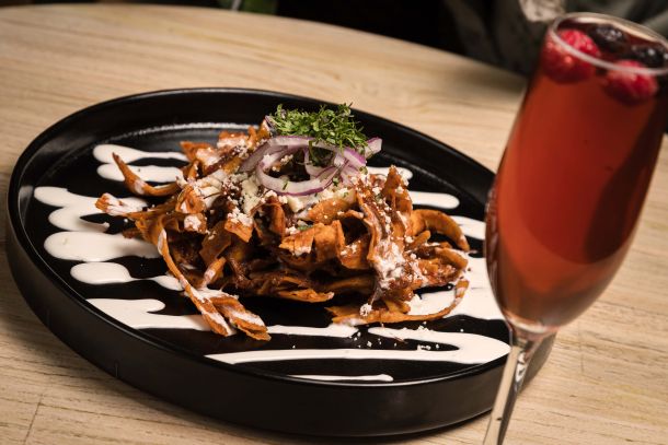 Tradicionales chilaquiles con un toque distintivo de nuestra salsa de chicharrón de cachete.
