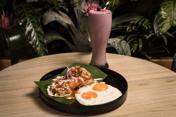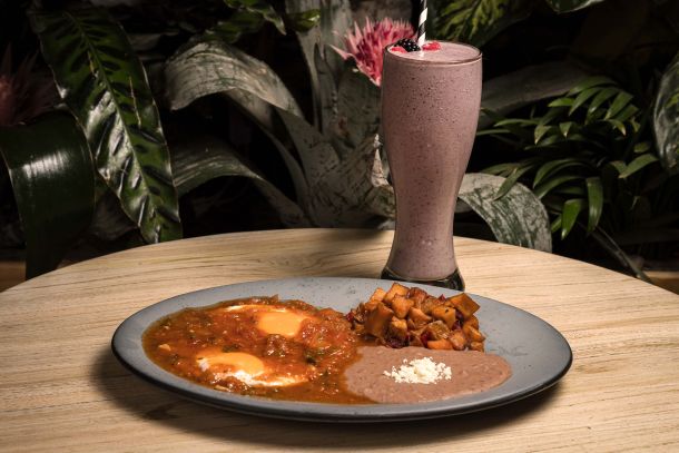 Totopos bañados en salsa de guajillo, crema y queso, acompañados con huevos estrellados, frijoles y papa country.
