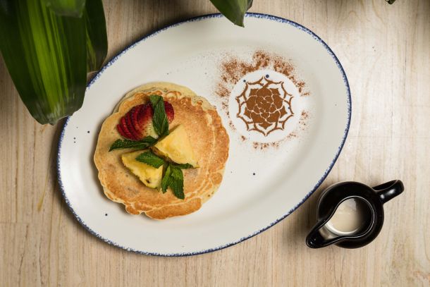 Deliciosos pancakes bañados en un mix de leche y piña.