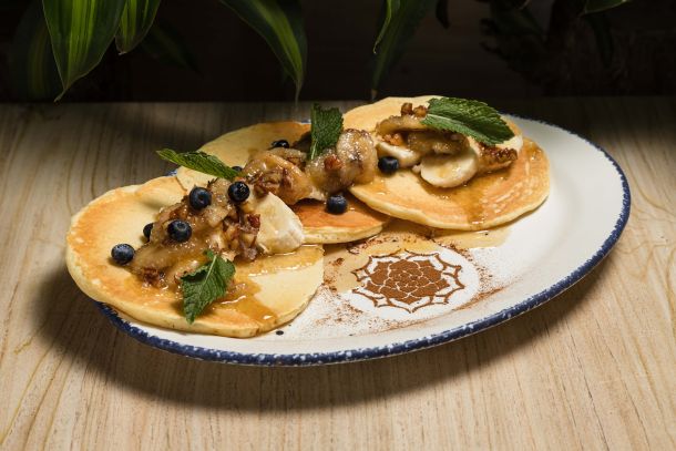 Deliciosos pancakes bañados en mermelada natural de plátano.