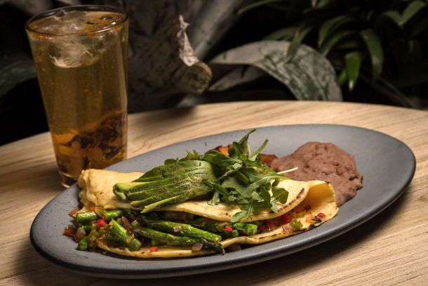 Delicioso omelette de queso, acompañado de frijoles refritos.