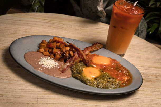Totopos bañados en salsa verde, crema y queso, acompañados con huevos estrellados, frijoles y papa country.