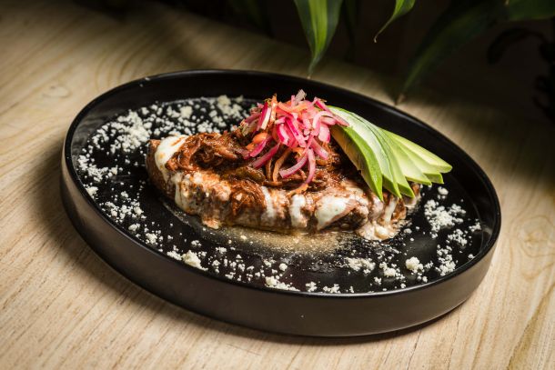 Hogaza tostada con una base de frijoles y bechamel, birria, un huevo estrellado..