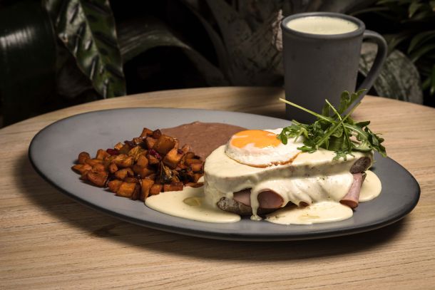 Sándwich de jamón bañado en salsa bechamel, con un huevo estrellado, acompañado de frijoles y papa country.