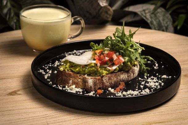 Pan de hogaza untado de aguacate, un huevo estrellado, espinaca, arugula, pico de gallo y queso molido.