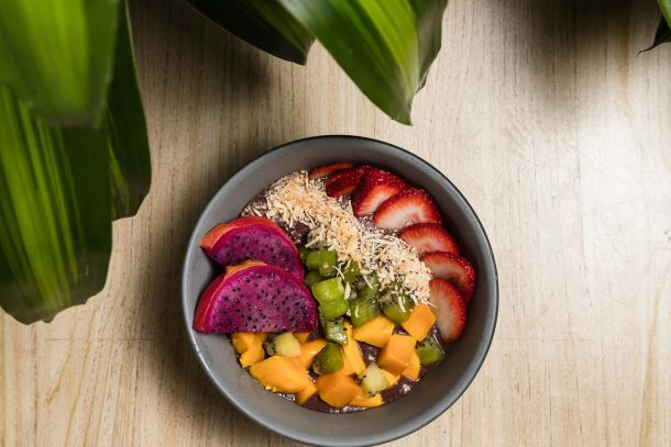 Base de frutos rojos y plátano con topping de coco, almendra y frutas de temporada.