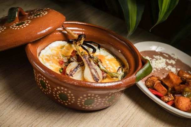 Huevos estrellados en una base de pan de elote, chorizo, bañados en salsa bechamel.